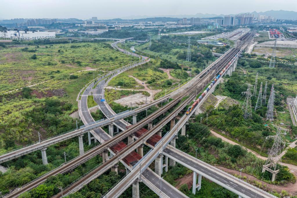 9月28日,西部陆海新通道班列在重庆鱼嘴站顺畅发车(无人机相片)新华社记者 唐奕 摄